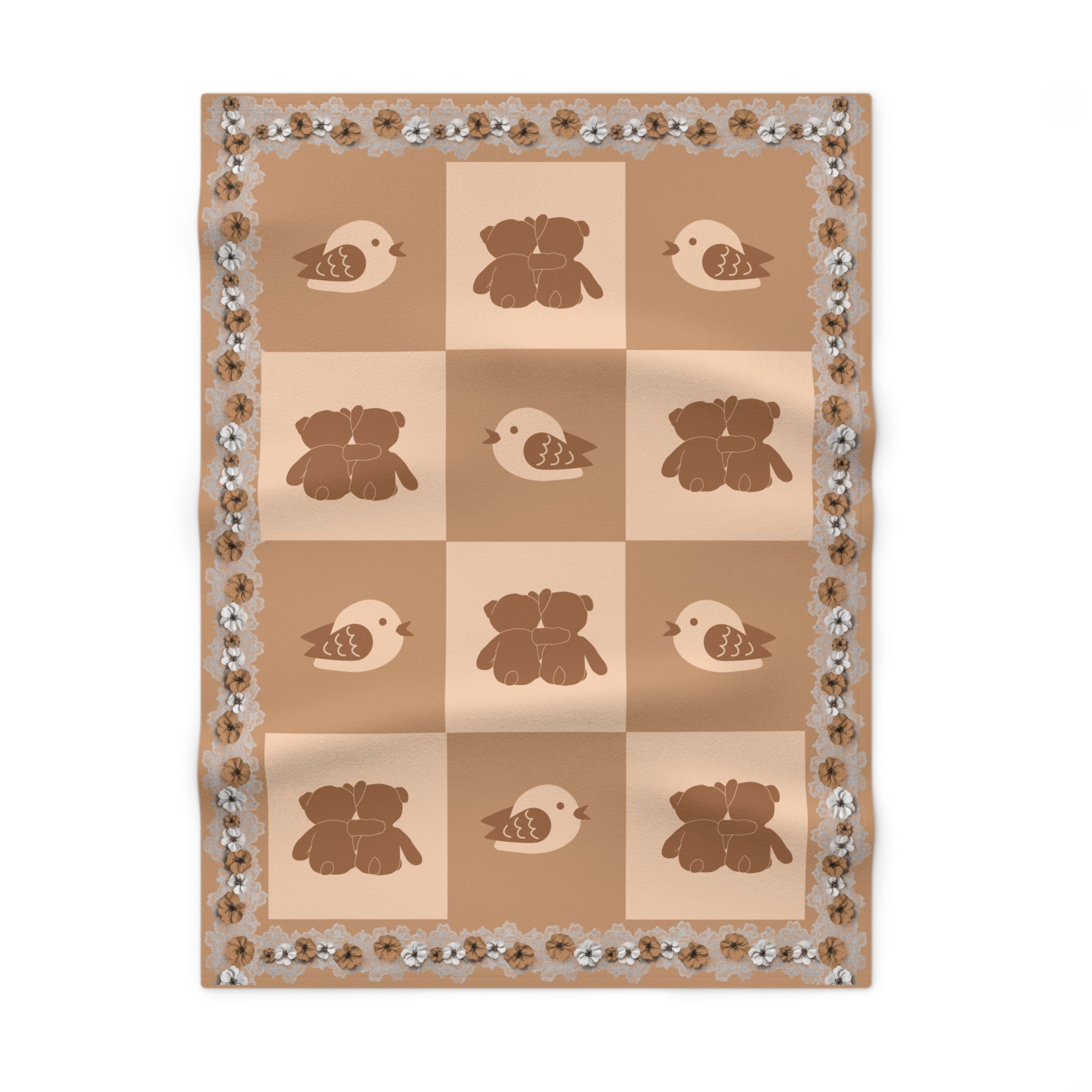 Fleece is king when it comes to fluffy softness. As such, the personalized fleece baby blanket is a cuddle necessity. 30” by 40”, this 100% polyester rectangle supports printing on one side. These items are preconstructed before printing, so exact symmetry is not guaranteed. Due to the microfiber construction, small colored dots may pop up. A cold wash cycle and a tumble dry, however, should reduce this possibility.