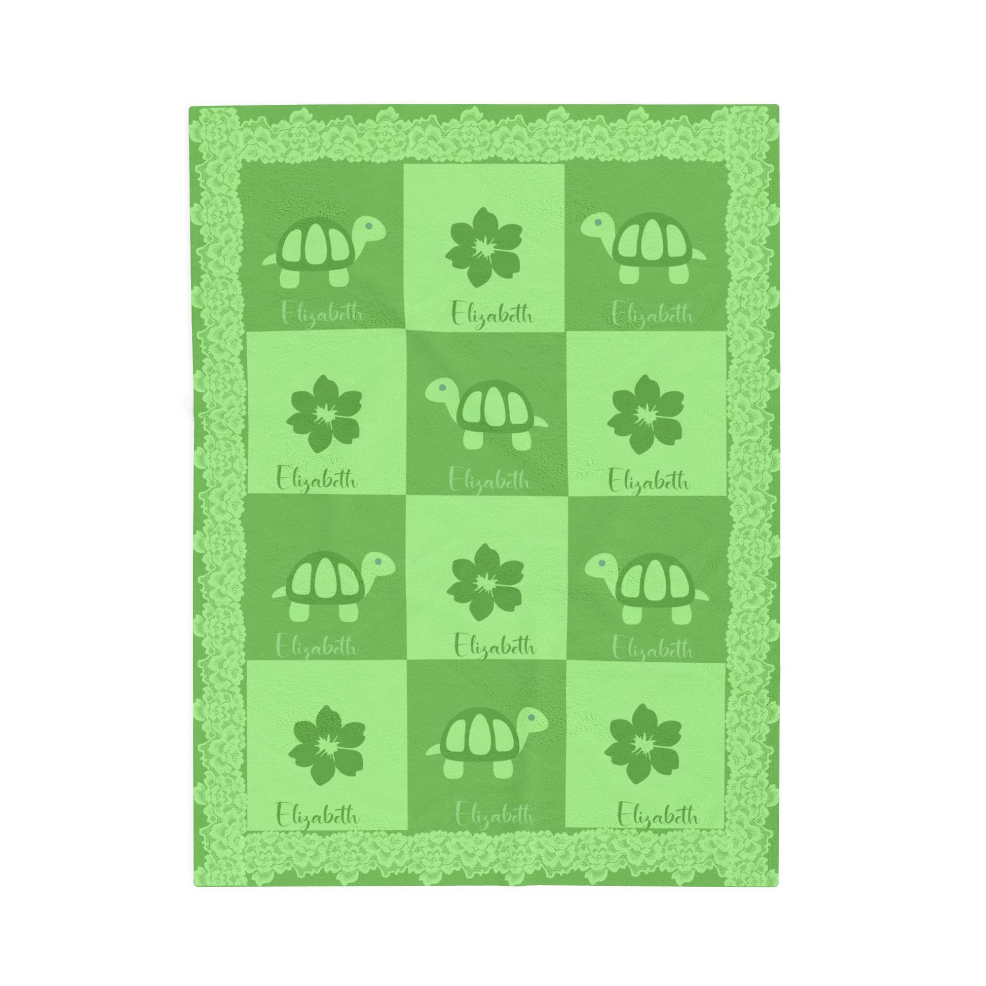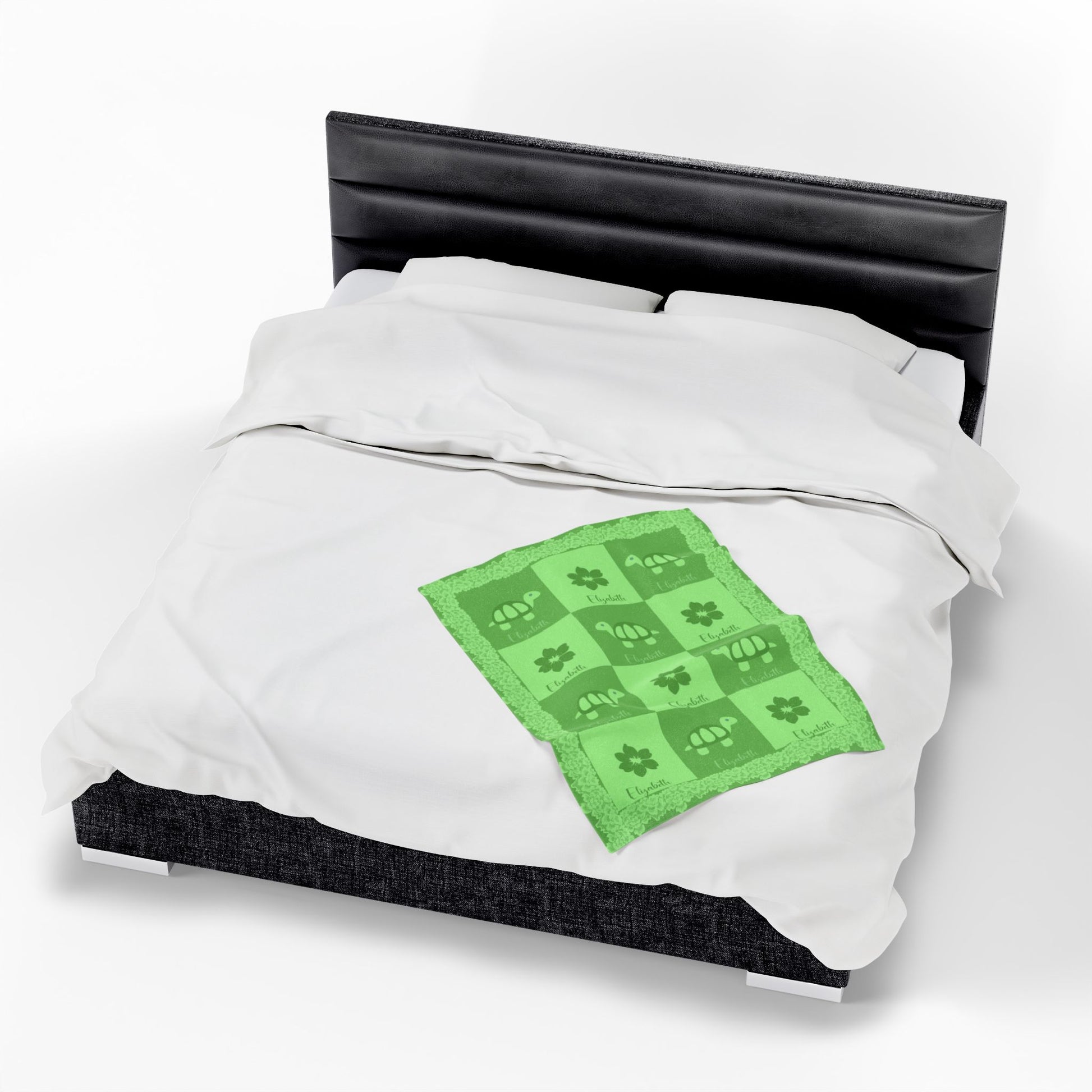 Fleece is king when it comes to fluffy softness. As such, the personalized fleece baby blanket is a cuddle necessity. 30” by 40”, this 100% polyester rectangle supports printing on one side. These items are preconstructed before printing, so exact symmetry is not guaranteed. Due to the microfiber construction, small colored dots may pop up. A cold wash cycle and a tumble dry, however, should reduce this possibility.