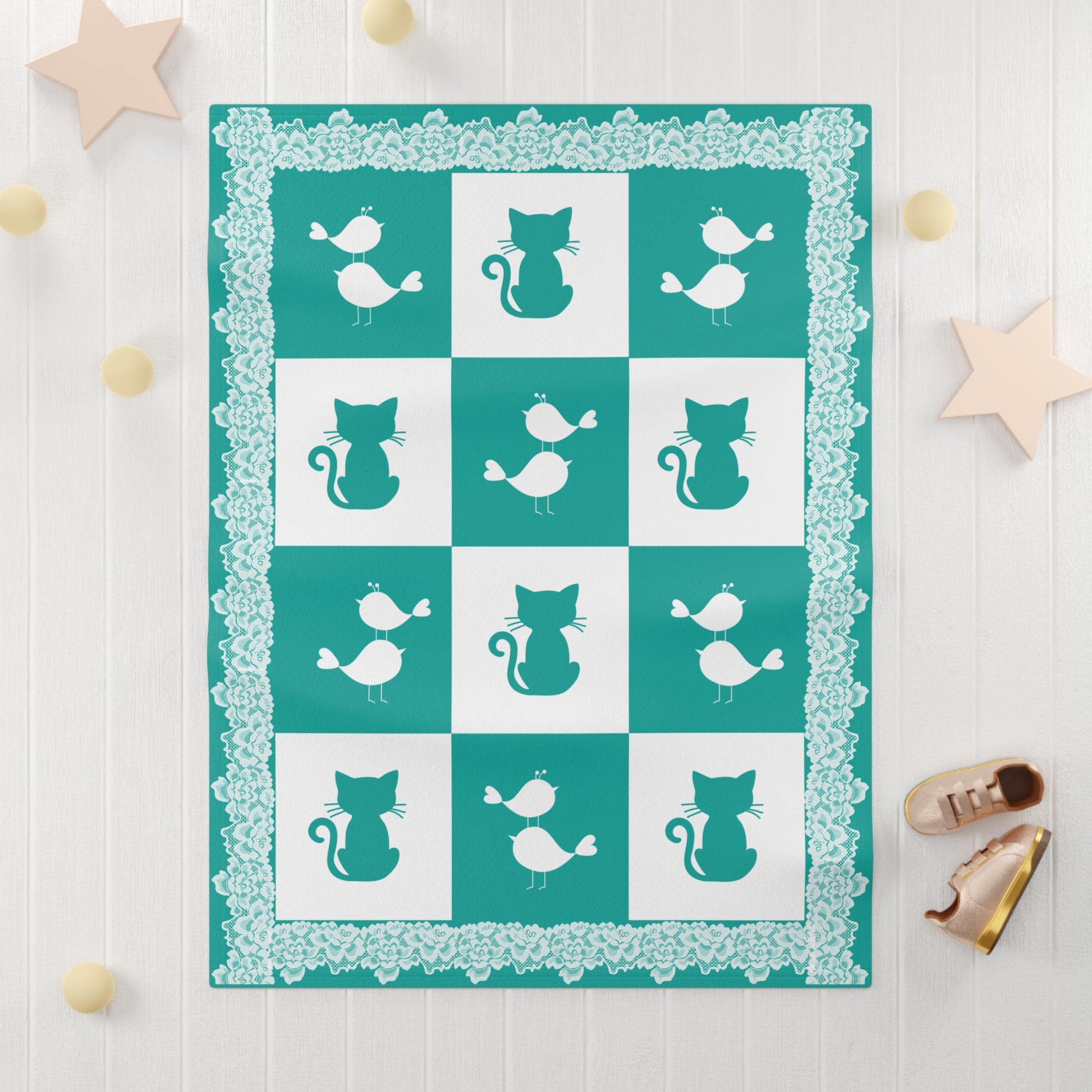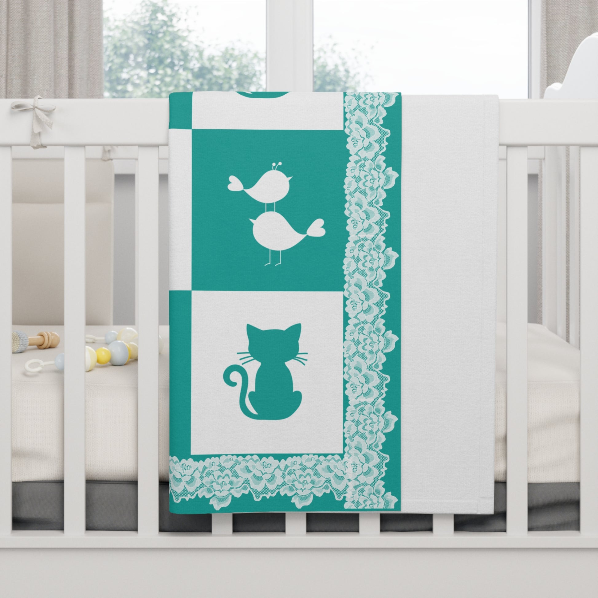 Wrap your little one in cozy softness with this Personalized Baby Fleece Blanket, featuring a charming cat and bird pattern in a modern teal and white color palette. Made from premium fleece material, this blanket is incredibly soft, lightweight, and gentle on delicate newborn skin—perfect for snuggling, naptime, travel, or everyday comfort.