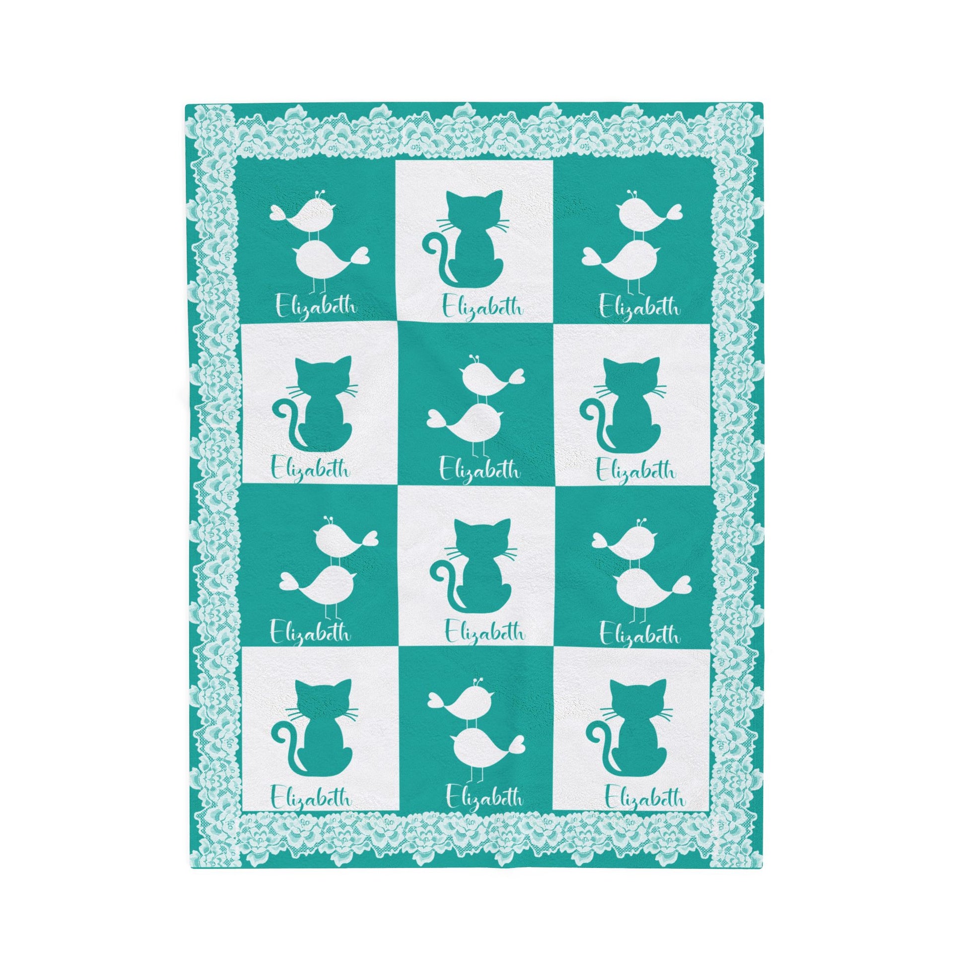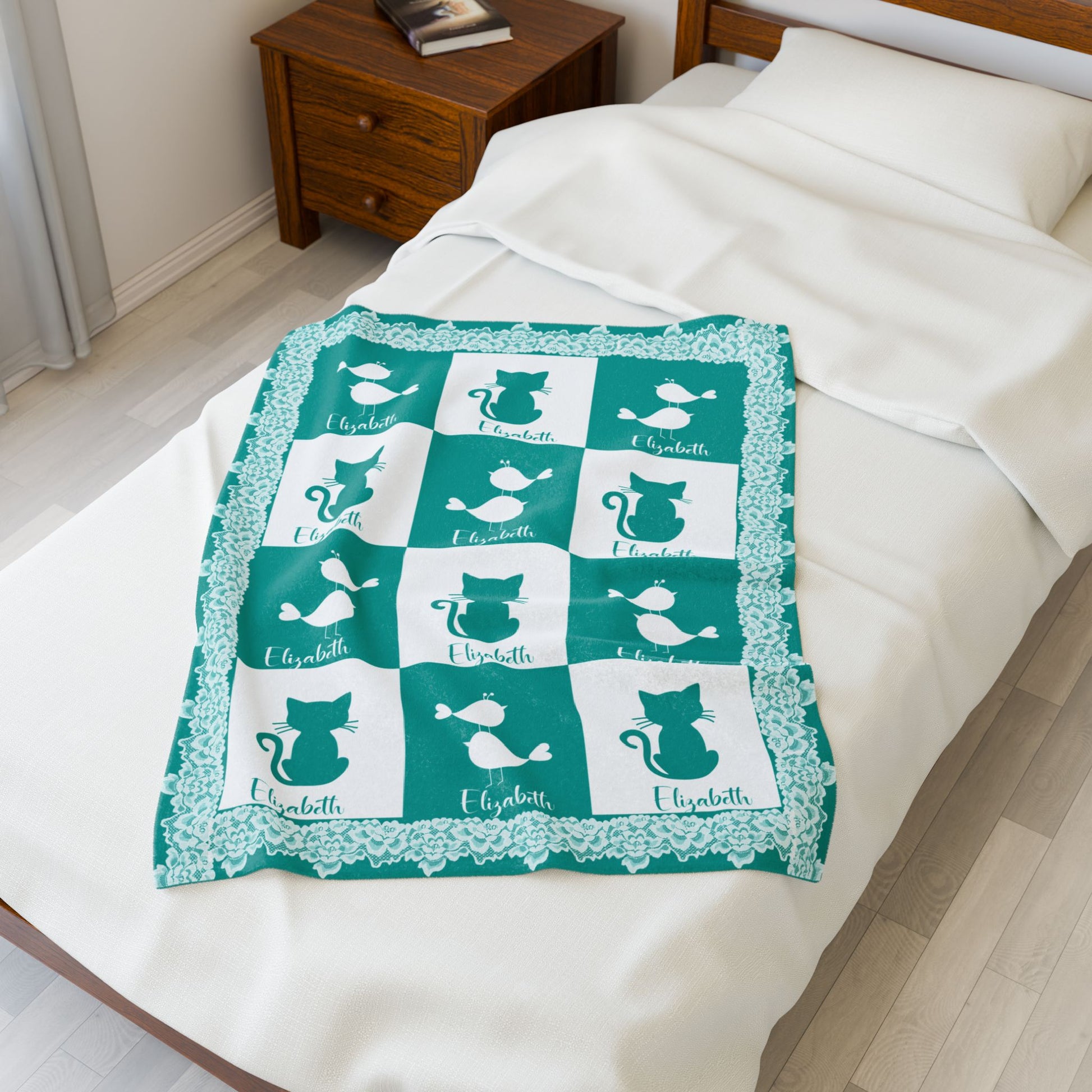Personalized Baby Fleece Blanket | Custom Name Cat & Bird Blanket |