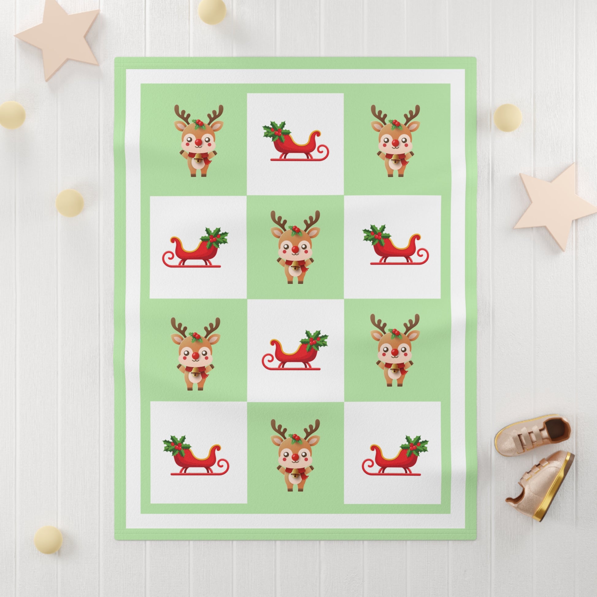 Each blanket is personalized with your baby’s name, creating a unique keepsake that will be treasured for years. The cute Christmas characters and soft green background make it a delightful addition to your holiday décor, baby’s nursery, or festive photo sessions.