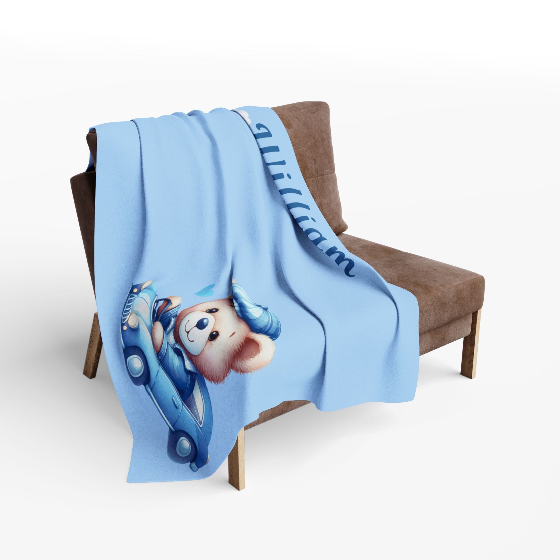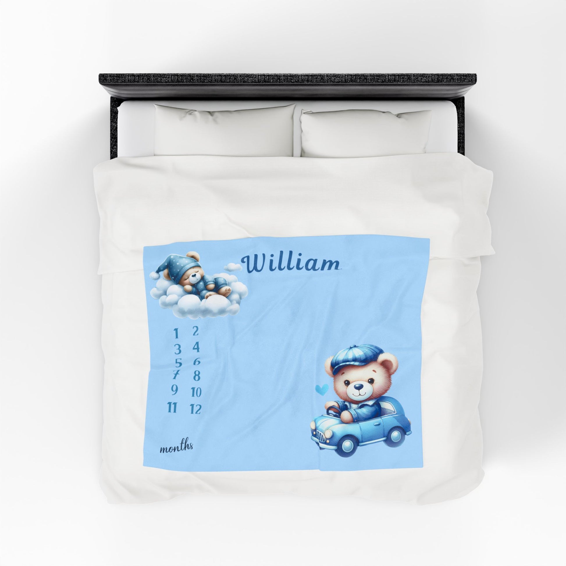 Featuring a sweet blue teddy bear design with clouds and cars, this blanket adds charm to any nursery. Personalize it with your baby’s name to make it truly unique — a cherished keepsake parents will treasure forever.