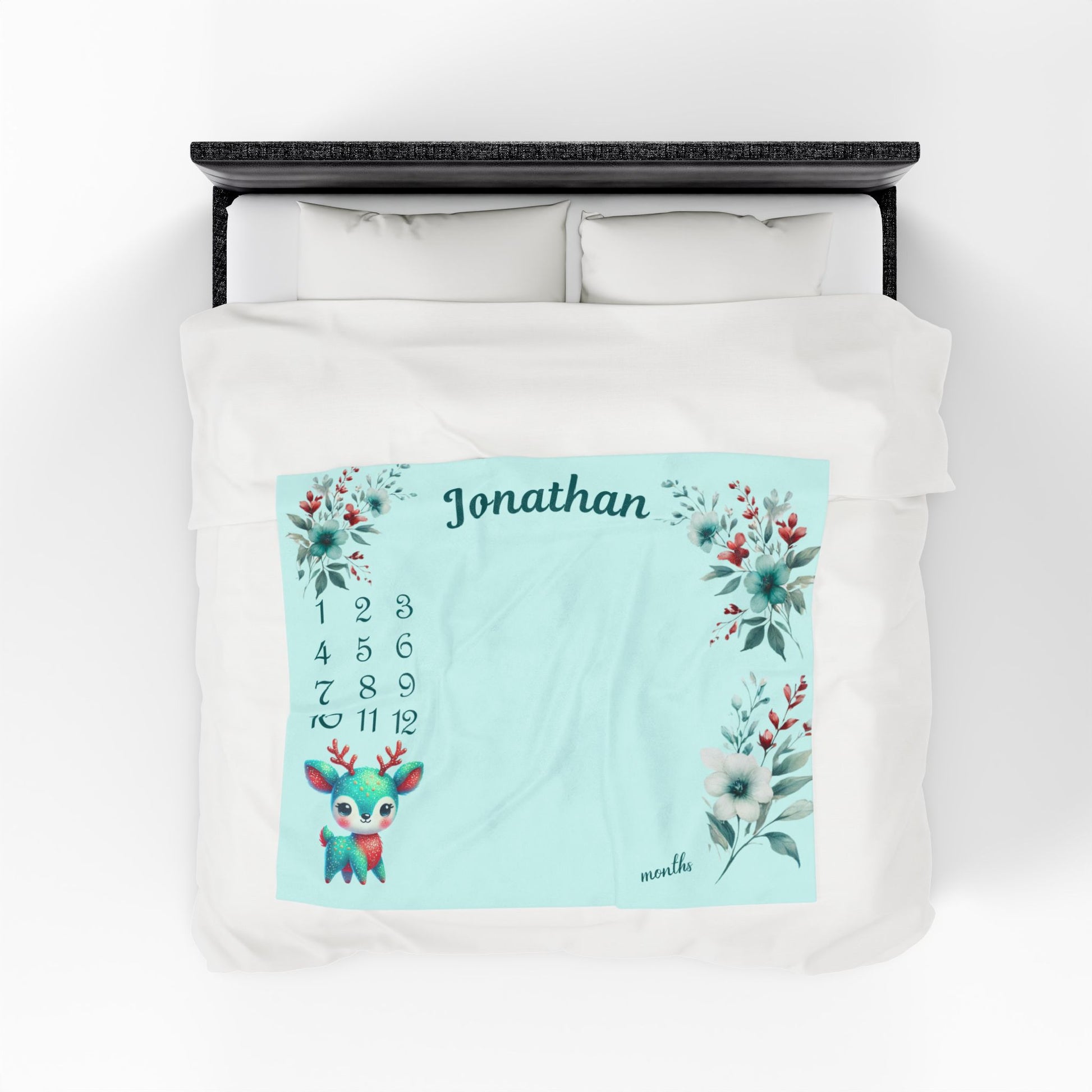 Celebrate your baby boy’s growth with our Personalized Deer Milestone Blanket, a perfect blend of comfort, cuteness, and keepsake charm. Designed with a sweet little deer and delicate floral accents, this baby milestone blanket creates a heartwarming backdrop for every photo — from your newborn’s first smile to their 12-month milestone.