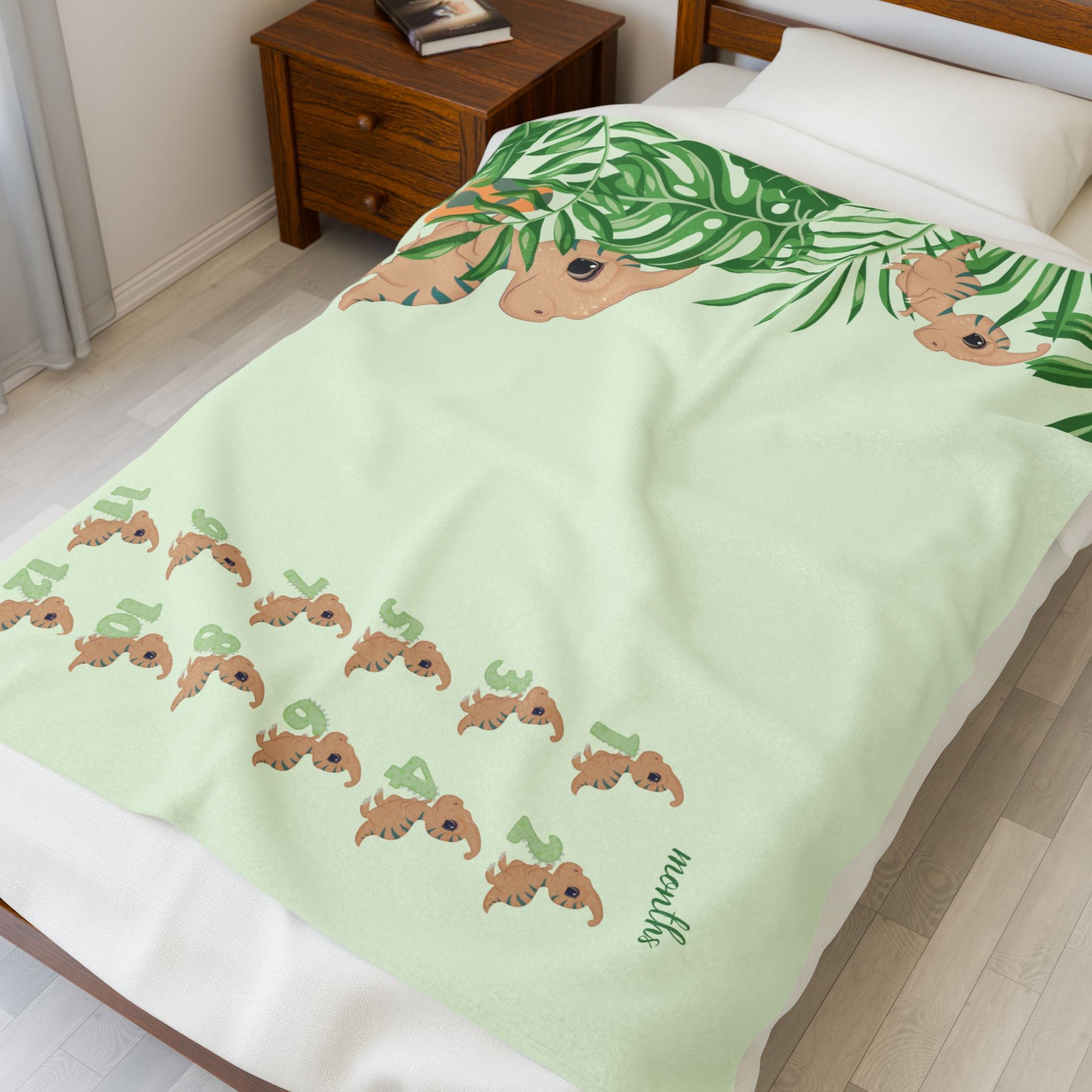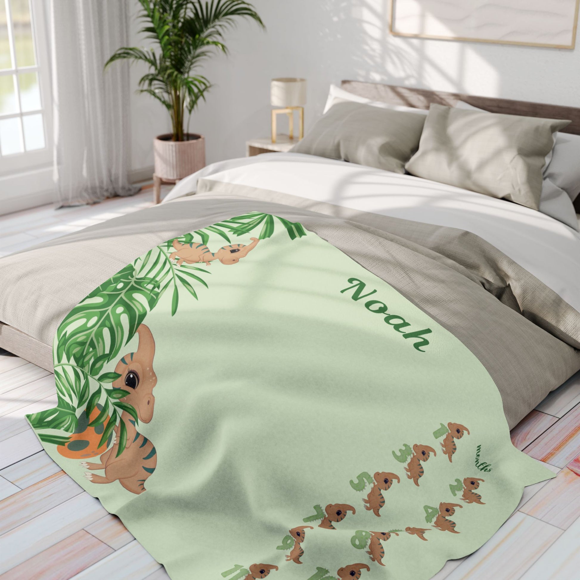 Capture every precious month of your little explorer’s first year with our personalized baby milestone blanket! Featuring a cute baby dinosaur and jungle leaves design, this baby boy milestone blanket is perfect for monthly photos, tummy time, and nursery decor.