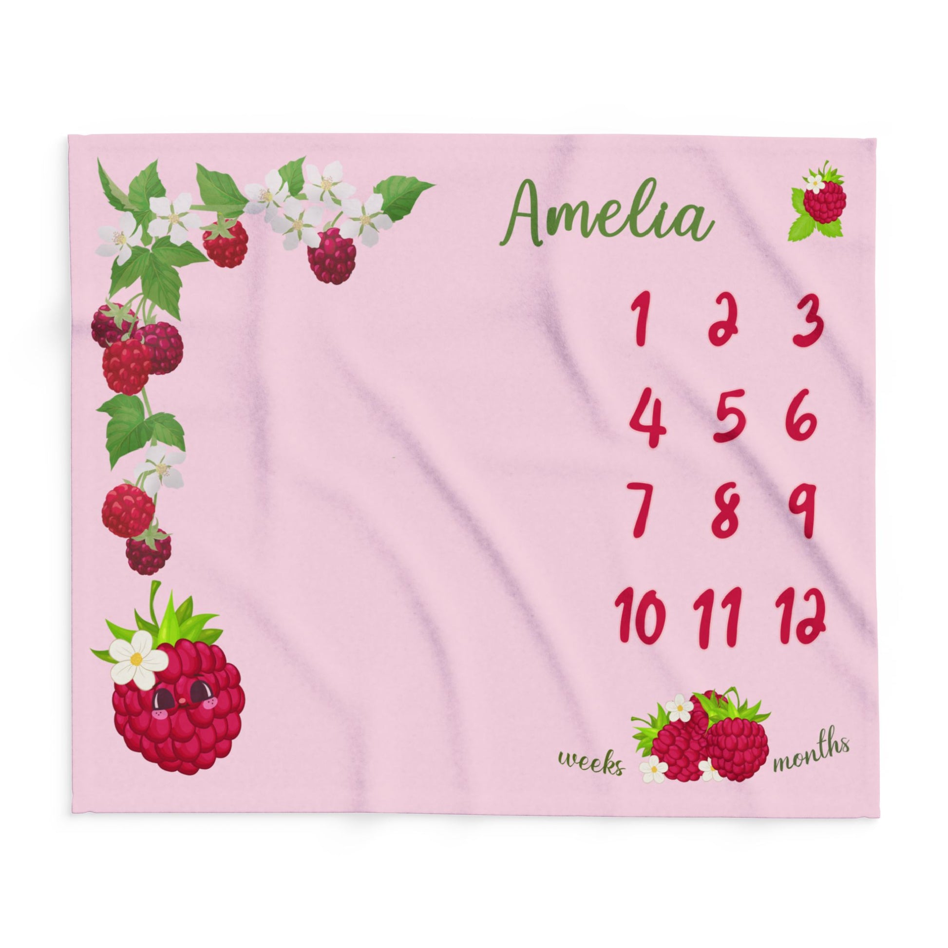Celebrate every precious moment with our Personalized Raspberry Milestone Baby Blanket, designed to make your baby’s growth journey extra sweet! This adorable blanket features a charming raspberry and floral design on a soft pink background — perfect for capturing your little one’s milestones in style.