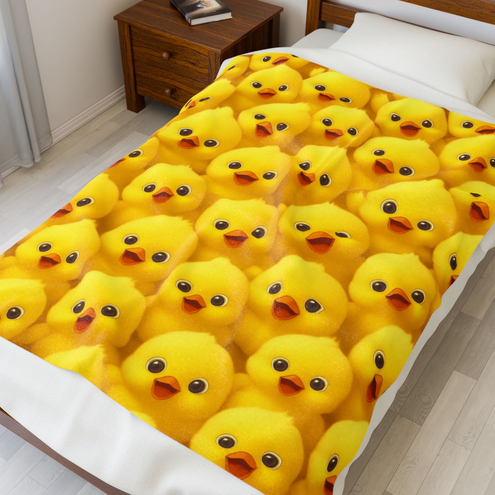 Bright, cheerful, and irresistibly soft, this velveteen plush chick blanket is the perfect way to add warmth and happiness to any space. Featuring an adorable all-over pattern of fluffy yellow baby chicks, this blanket brings a fun, playful vibe that kids and adults alike will love.